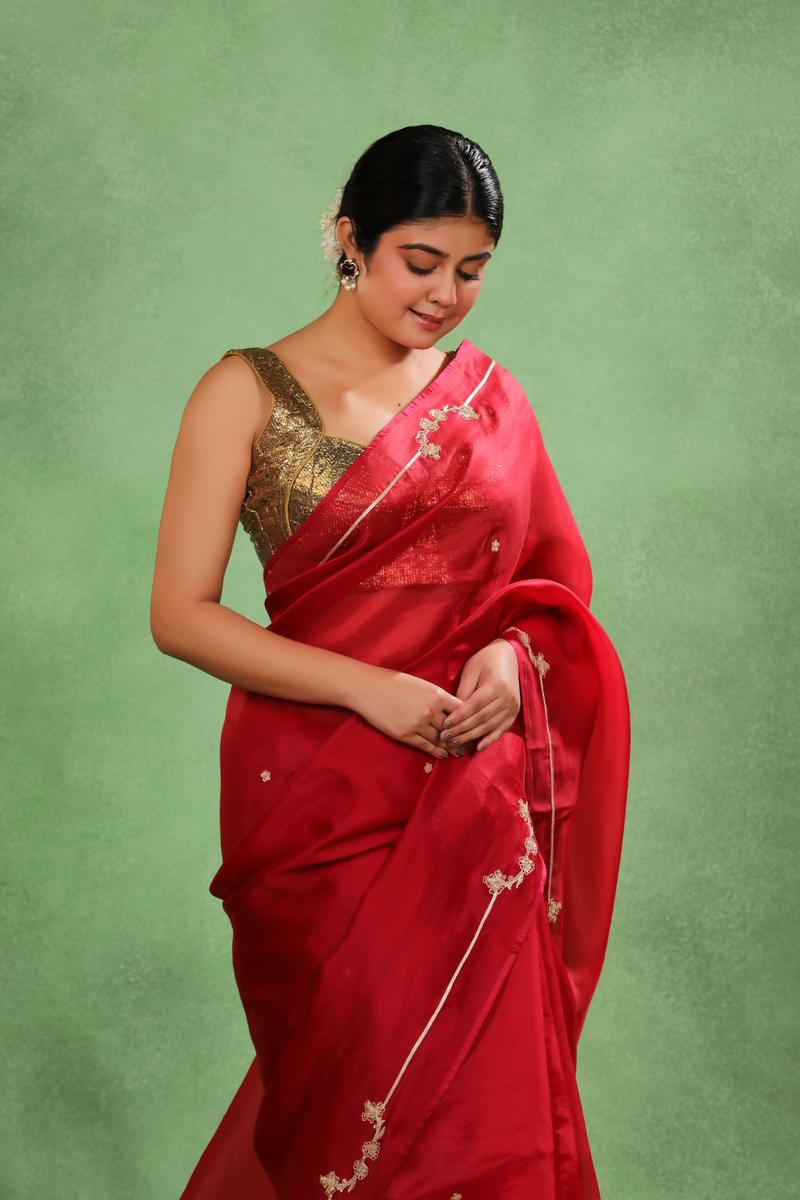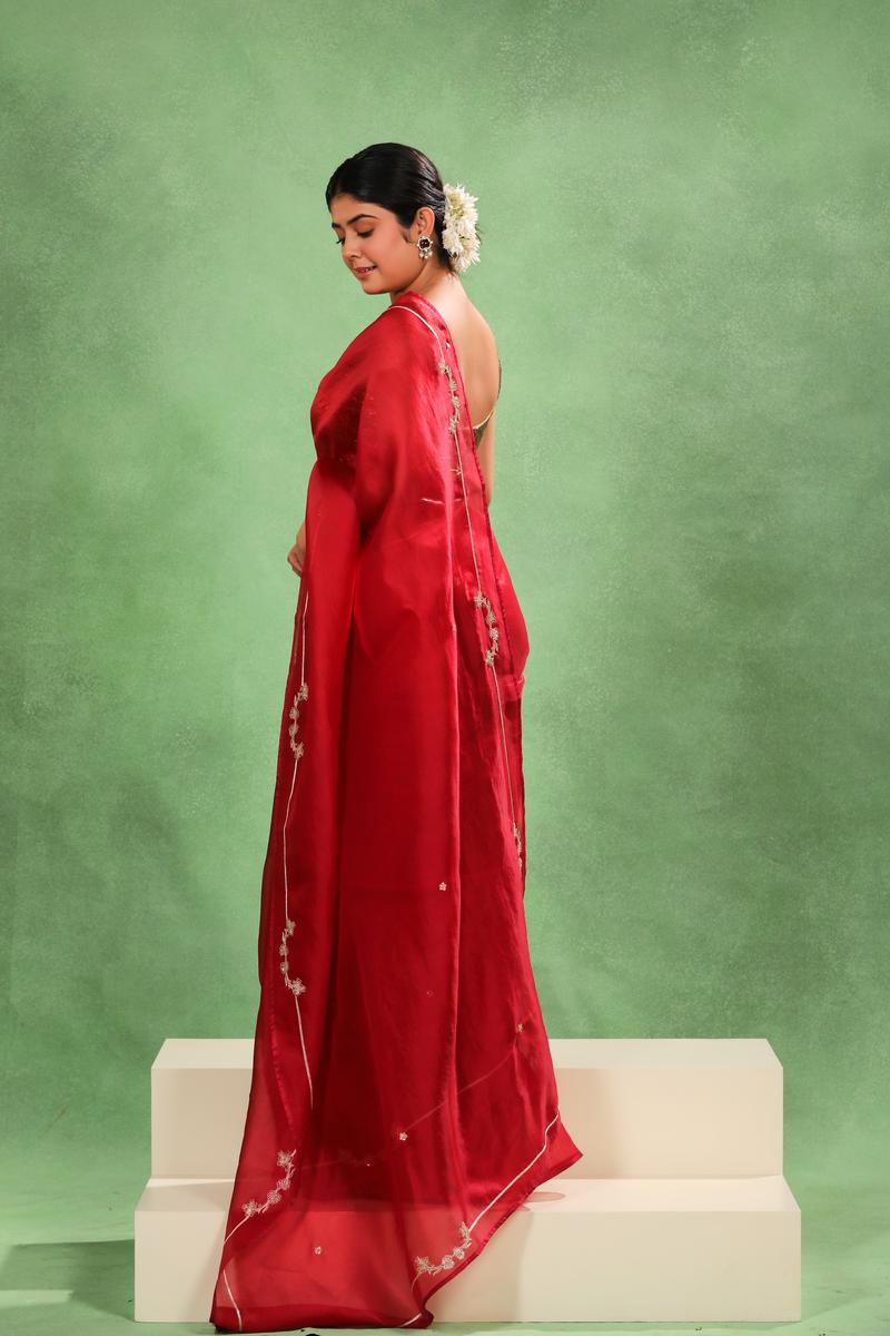 ⦁ Styling Tip: Style the saree with a contrast blouse from the provided options and keep accessories minimal to let the embroidery and gota patti work stand out. Opt for subtle makeup with a bold lip to enhance the rich red tone of the saree.