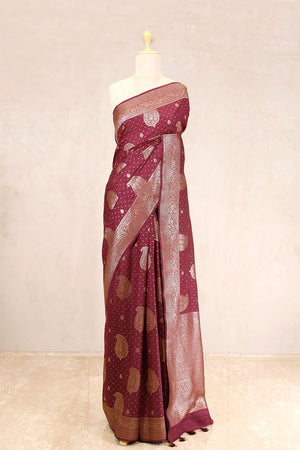 This Brown saree is woven with gold zari Paisley motifs and small floral motifs spread across the chiniya silk body, creating a balanced and intricate design. The saree is further accentuated with a floral antique zari woven border and pallu, adding depth to its traditional appeal. It comes with a matching unstitched blouse piece for custom tailoring.