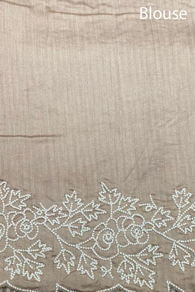 Handwoven in Banaras, this shiny tissue stripe sari when paired with a chic tissue silk stone work blouse, makes a perfect outfit for a cocktail or a night out. The scallop border with embellishment of stone work adds the perfect glam. Recommend experimenting with the drape & wearing statement earrings to stand out. It comes with matching unstitched blouse piece.
