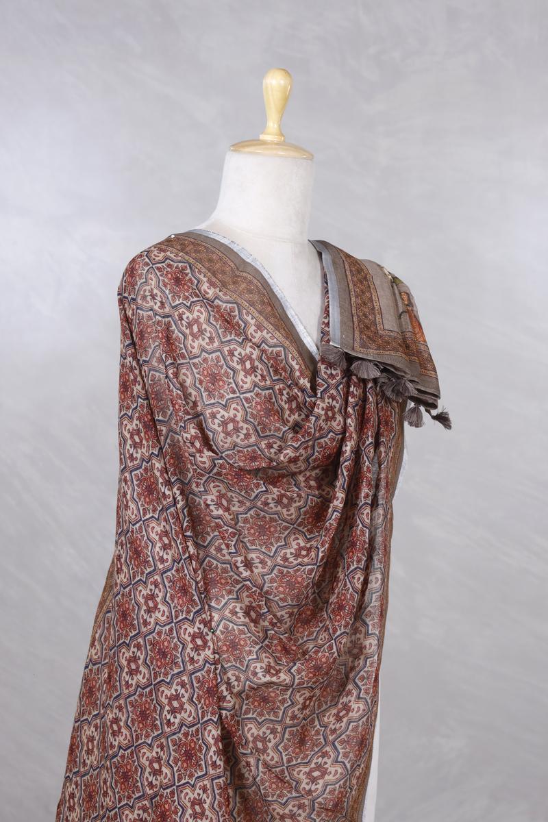 This pure linen dupatta in a rich brown tone features an all-over Ajrakh-style geometric printed jaal. The pallu is beautifully designed with detailed Pichwai art, and the look is completed with a 1 cm silver zari woven stripe along the edges.