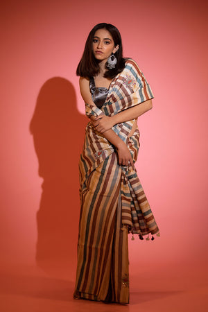 This saree is a masterpiece that seamlessly merges modern style with traditional craftsmanship, making it the perfect choice for any occasion, where beauty and sophistication coexist. Crafted from the finest tussar silk fabric, this one is an apt pick to be worn to grace any occasion. An array of multicolour vertical stripes gracefully cascades throughout the fabric. Each stripe is a testament to contemporary fashion, while the hand-embroidered floral butas add an exquisite touch of artistry.