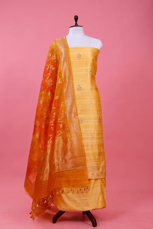You will don a distinct look when you wear a dress made using this raw silk dress material which is adorned with a rich display of gold zari woven floral buta throughout. The ensemble exudes opulence with its lavish gold zari woven border, adding a touch of grandeur. The accompanying organza silk dupatta features a captivating floral jaal woven in rangkat style, enhancing its unique charm. Paired seamlessly with a plain matching bottom, this dress material epitomizes sophistication for a truly enchanting look.
