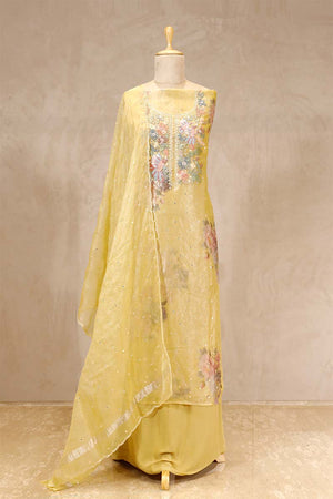 Styling Tips: Pair this light yellow dress material with minimal gold jewelry and a matching clutch for a soft festive look.