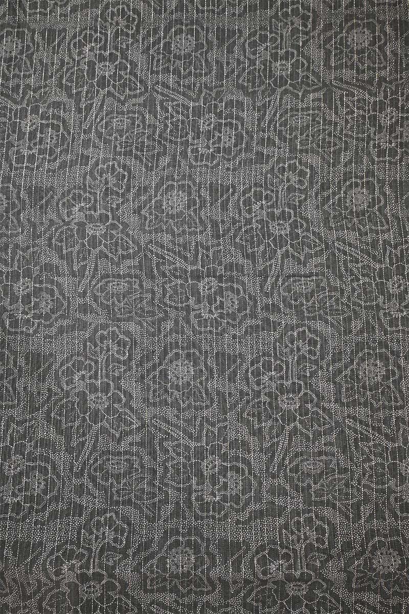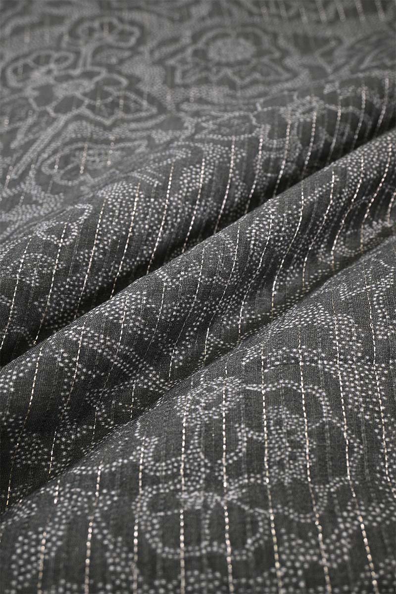 This Charcoal Grey Chanderi digital floral printed fabric features refined floral motifs enhanced with fine zari stripe vertical lines and resham woven lines running alternately across the fabric. The deep charcoal grey base lends a modern, sophisticated appeal, while the subtle zari and resham detailing adds a soft sheen and graceful elegance.
