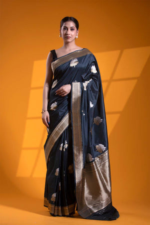 This Black Banarasi saree is an artistic piece of ancient Egyptian and Indian art, featuring intricate gold & silver zari woven motifs that combine a sunflower with the goddess Bastet. The saree is handloom woven with pure Katan silk fabric enriched with detailed gold & silver zari ethnic work on the border and pallu, highlighting its unique craftsmanship. It comes with a matching running unstitched blouse piece for custom tailoring.