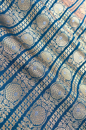 Nail the perfect look for the upcoming event by stitching an outfit from this classic blue-colored fabric. Made of quality banarasi silk, this fabric has a sheen and fall that cannot be missed. The woven gold zari stripes all over add to the overall charm of this piece making it a compelling buy. Light in weight, this fabric also makes a good gifting option.