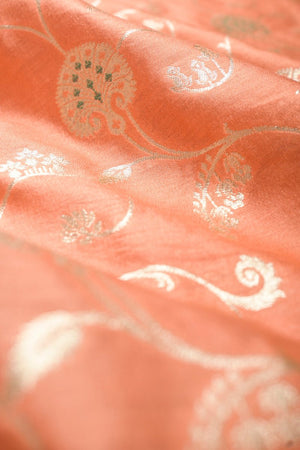 This Coral Peach hand-woven mulberry Silk Than comes with woven silver zari floral jaal motifs that surface fabric pattern including meenakari motifs. A fabric made by handloom weaving, for your quintessential statement party wear.