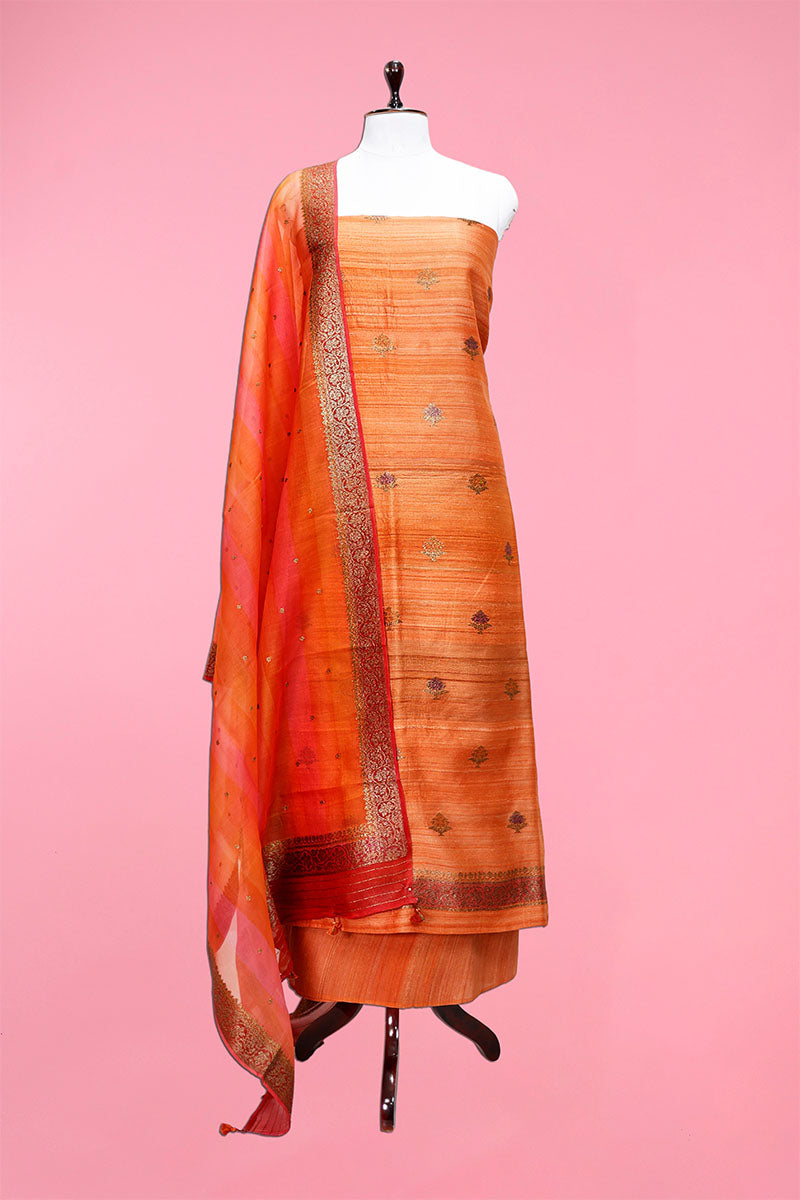 Colorful and vibrant, this coral peach-colored dress material is a worthy acquisition for your wardrobe. Made of quality tussar silk fabric, this set has a wonderful shine and is light in weight. The kurta material has antique zari woven buti all over and contrast border.The organza silk dupatta has a rangkat dye with antique zari contrast border that makes it stand out from the rest. Team the outfit with matching accessories to don an immaculate look. Actual color may slightly vary from the Image