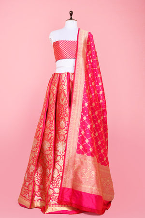 Features: Handwoven gold & silver zari weaving, the skirt has gold & silver zari woven floral motifs, the dupatta has gold zari geometrical motifs along with a woven border, and it has an unstitched running blouse which has woven small butis.