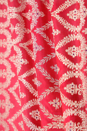 Make a statement with our Crimson Red Banarasi Silk Than. Hand-woven to perfection, it features intricate gold zari leaf buta motifs and meenakari patterns, adding a touch of elegance. Crafted from pure Banarasi silk, its lustrous texture exudes sophistication. Perfect for special occasions, the regal hue of Deep Red ensures you stand out. Elevate your ensemble with this timeless piece, a harmonious blend of tradition and luxury.