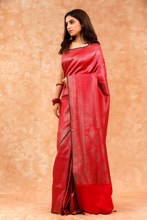 Introducing our exquisite antique zari woven saree, a tribute to timeless craftsmanship. Adorned with intricate ethnic motifs woven in antique zari throughout, it exudes heritage charm. The antique zari woven pallu adds a touch of regal elegance. Accompanied by a matching unstitched blouse piece, this ensemble offers versatility in styling. Elevate your wardrobe with this stunning saree, promising to captivate with its fusion of tradition and luxury in every drape.