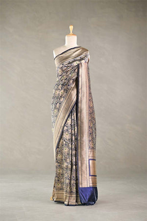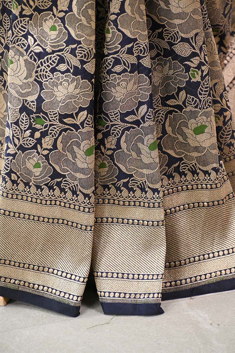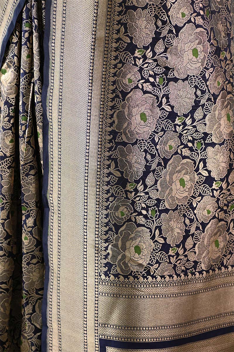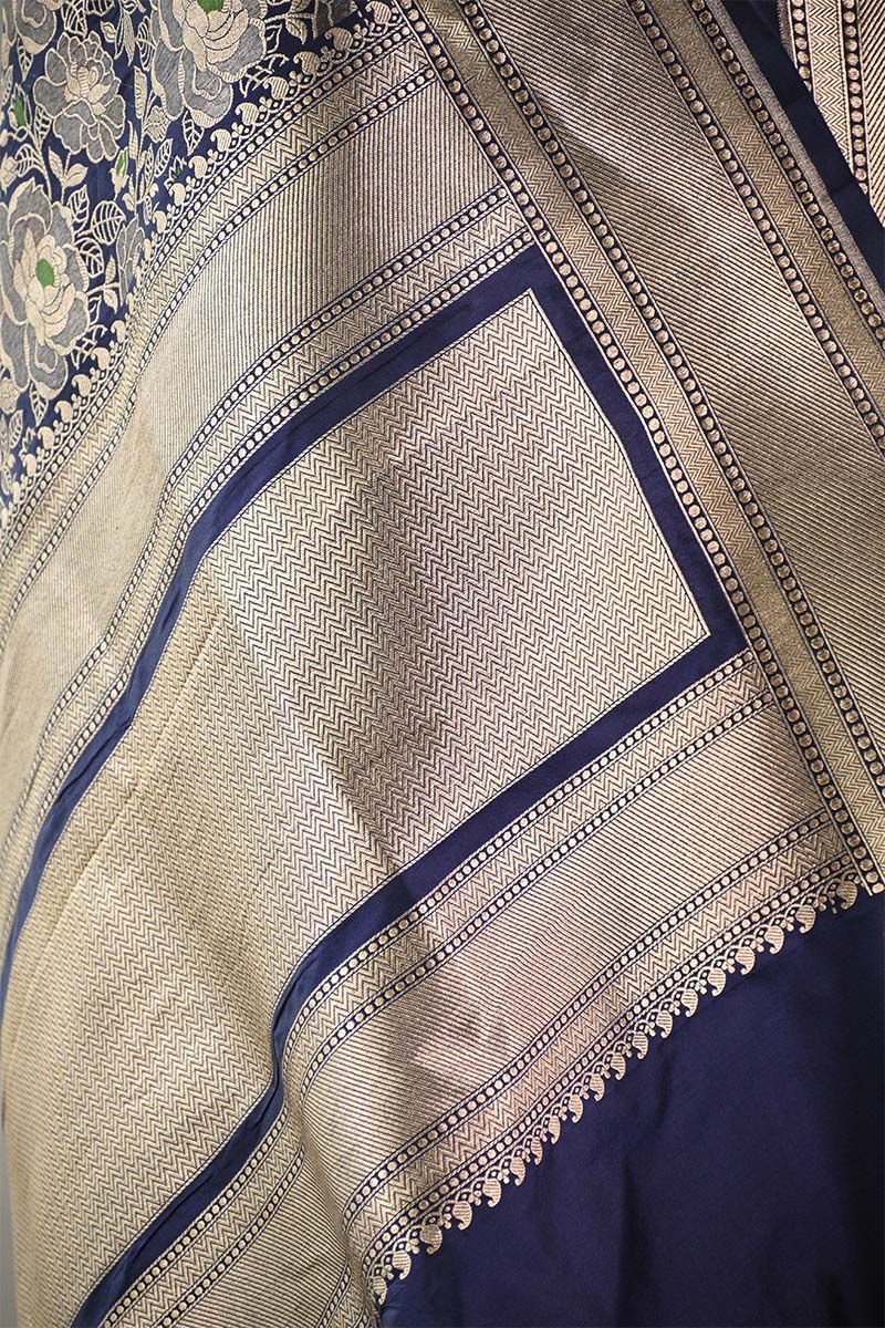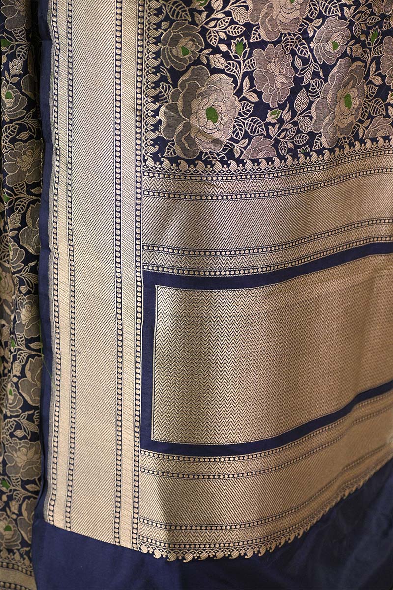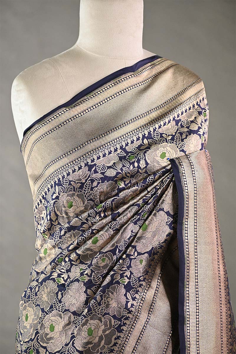This deep blue pure Banarasi katan silk saree is adorned with an intricate gold zari woven rose motif jaal, highlighted with green meenakari detailing across the body. The border and pallu are woven with a geometric brocade pattern in gold zari. It is paired with a matching blue blouse piece finished with a gold zari woven border.