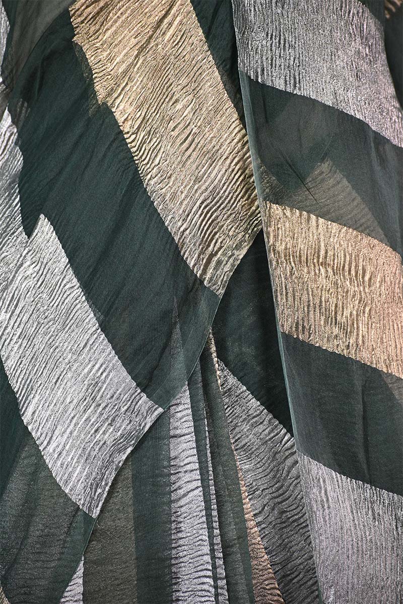 This deep green pure organza silk saree is designed with crushed tissue gold and silver zari woven stripes for a contemporary appeal. It is paired with a matching unstitched blouse piece embellished with pitta zari work for custom stitching.