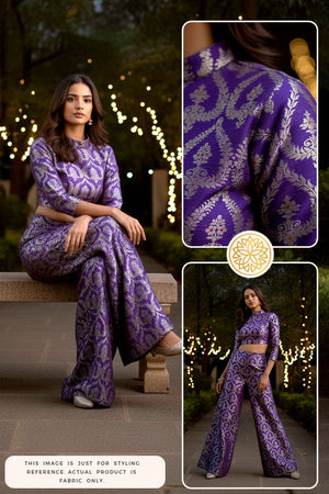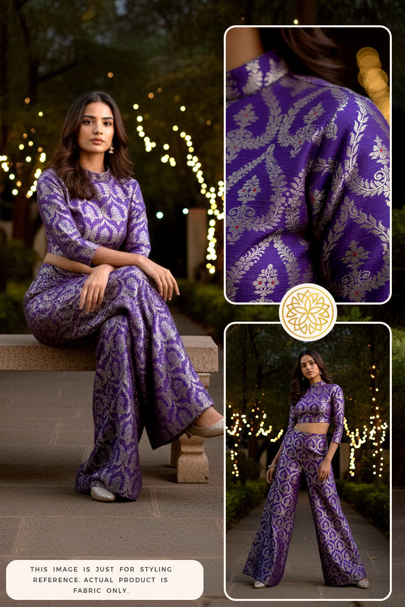 This Deep Purple hand-woven Banarasi Silk Than comes with woven silver zari leaf buta motifs that surface fabric pattern including meenakari motifs. A fabric made by handloom weaving, for your quintessential statement party wear.