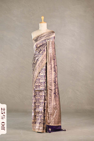 This Deep Purple pure Banarasi katan silk saree features intricate gold zari woven pichwai cow and swan with intricate kalamkari woven jaal pattern all over the body. The border is designed with intricate elephant and floral woven patterns and complemented with embellished lace work on the border edges. The pallu is made with golde zari woven floral brocade work. It comes with a matching unstitched blouse piece for customized tailoring.