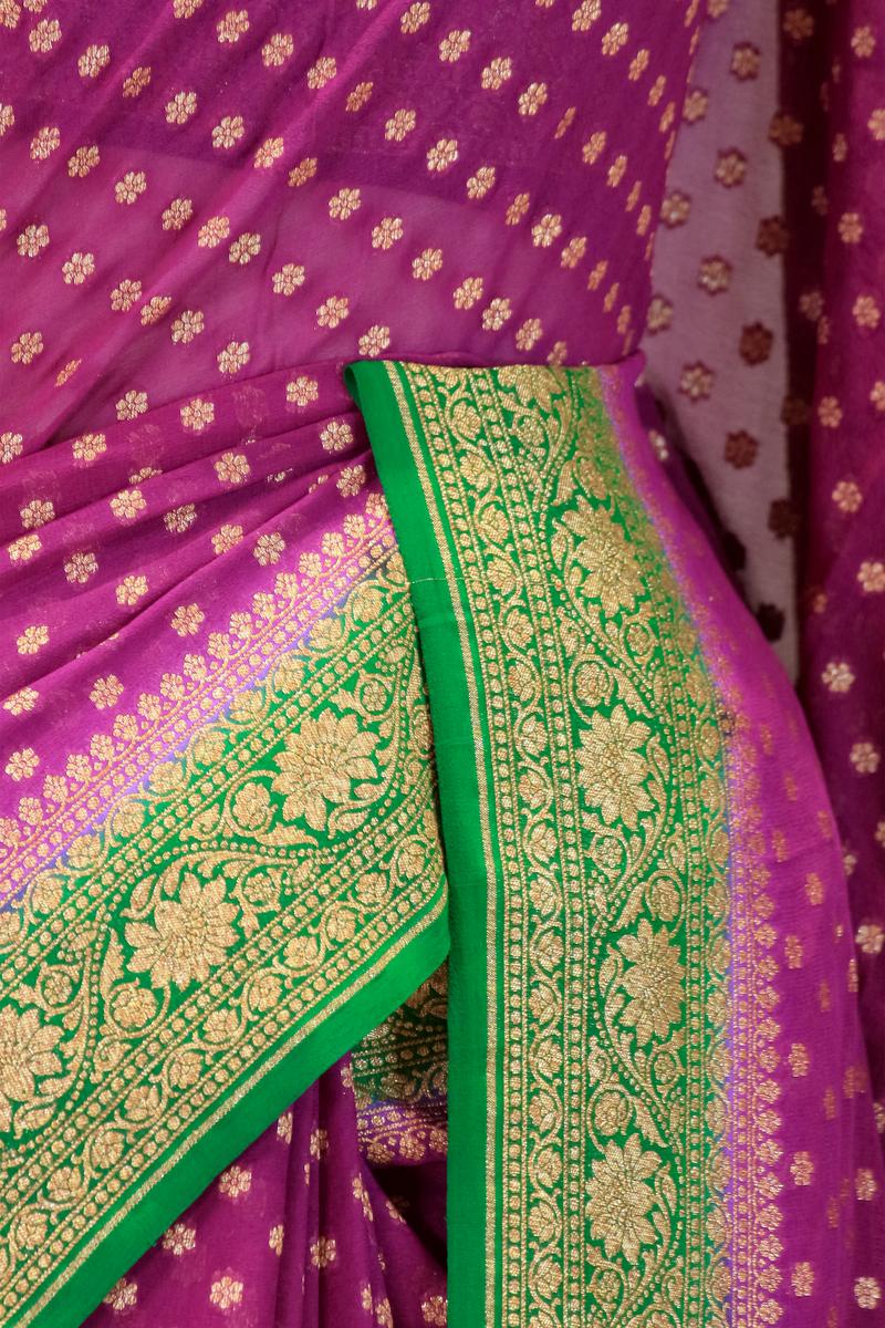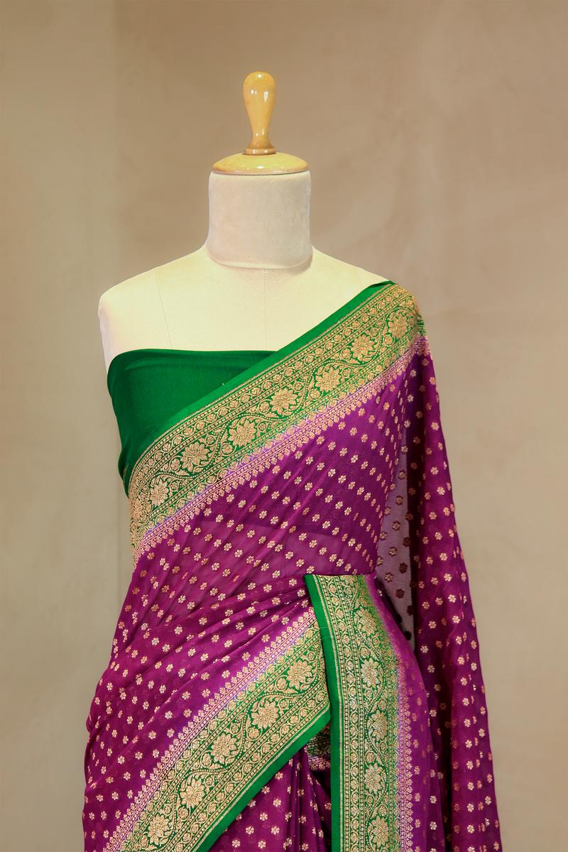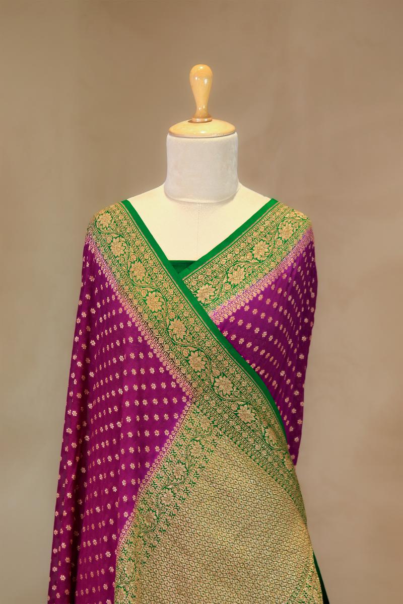This deep purple Banarasi handloom georgette Khaddi silk saree is adorned with gold zari woven butis across the body. The saree is accentuated with a vibrant green contrast border and pallu, intricately designed with floral zari patterns, creating a striking visual appeal. It comes with a matching unstitched blouse piece.