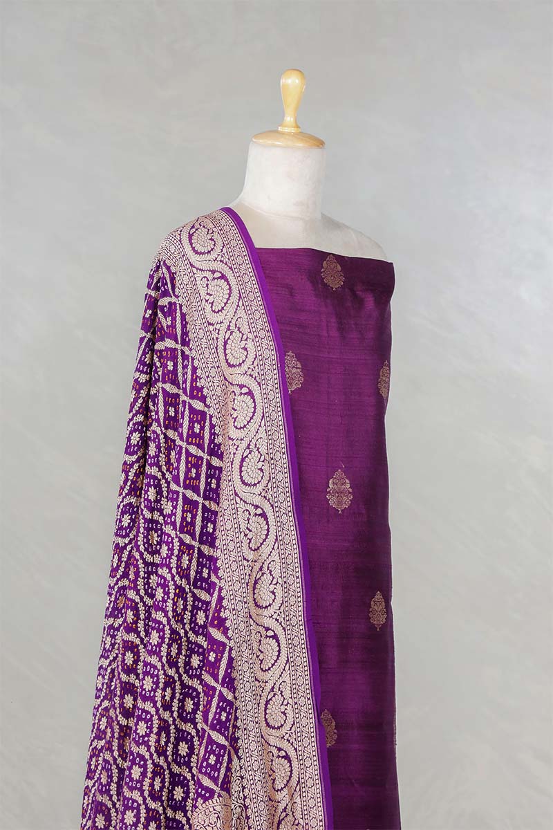 This deep purple pure raw silk suit set is a classic choice for festive events and traditional gatherings. The kurta features antique zari woven buta all over, complemented by an antique zari woven border on the hemline. It is paired with a coordinated bottom fabric that also has an antique zari woven border. The set includes a deep purple bandhani dupatta, intricately woven with zari all over, completing this elegant dress material ensemble.