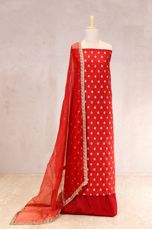 This Deep Red Chiniya silk suit set is a premium choice for festive celebrations and cultural gatherings. The kurta is adorned with water gold zari woven floral buti all over, adding a subtle shimmer. Paired with an embellished organza silk dupatta and a matching running bottom pant, this dress material offers a well-coordinated look perfect for special occasions.