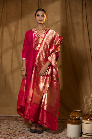 Tips: Pair this deep red handloom rangkat Katan silk dupatta with a matching red kurta for a harmonious look or choose a contrasting gold kurta for a bold statement.