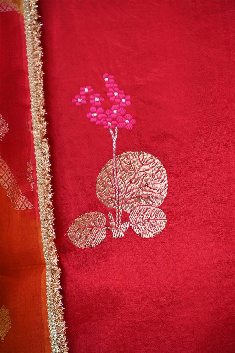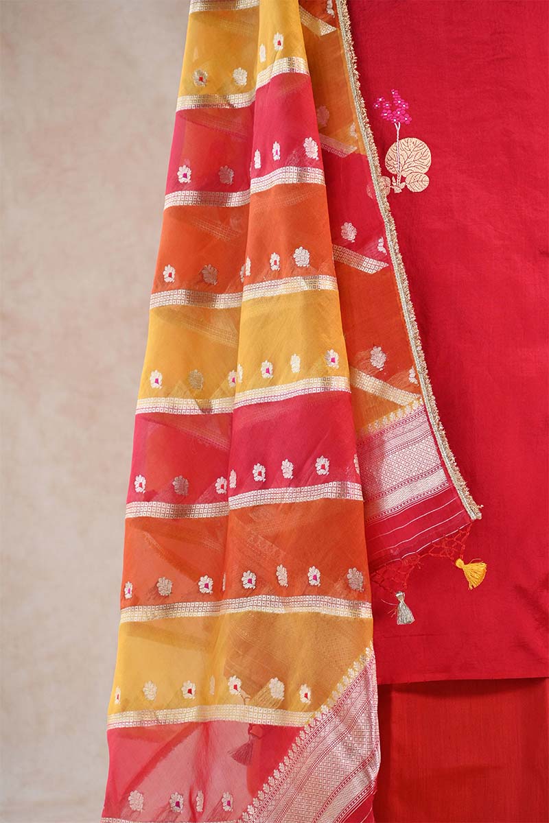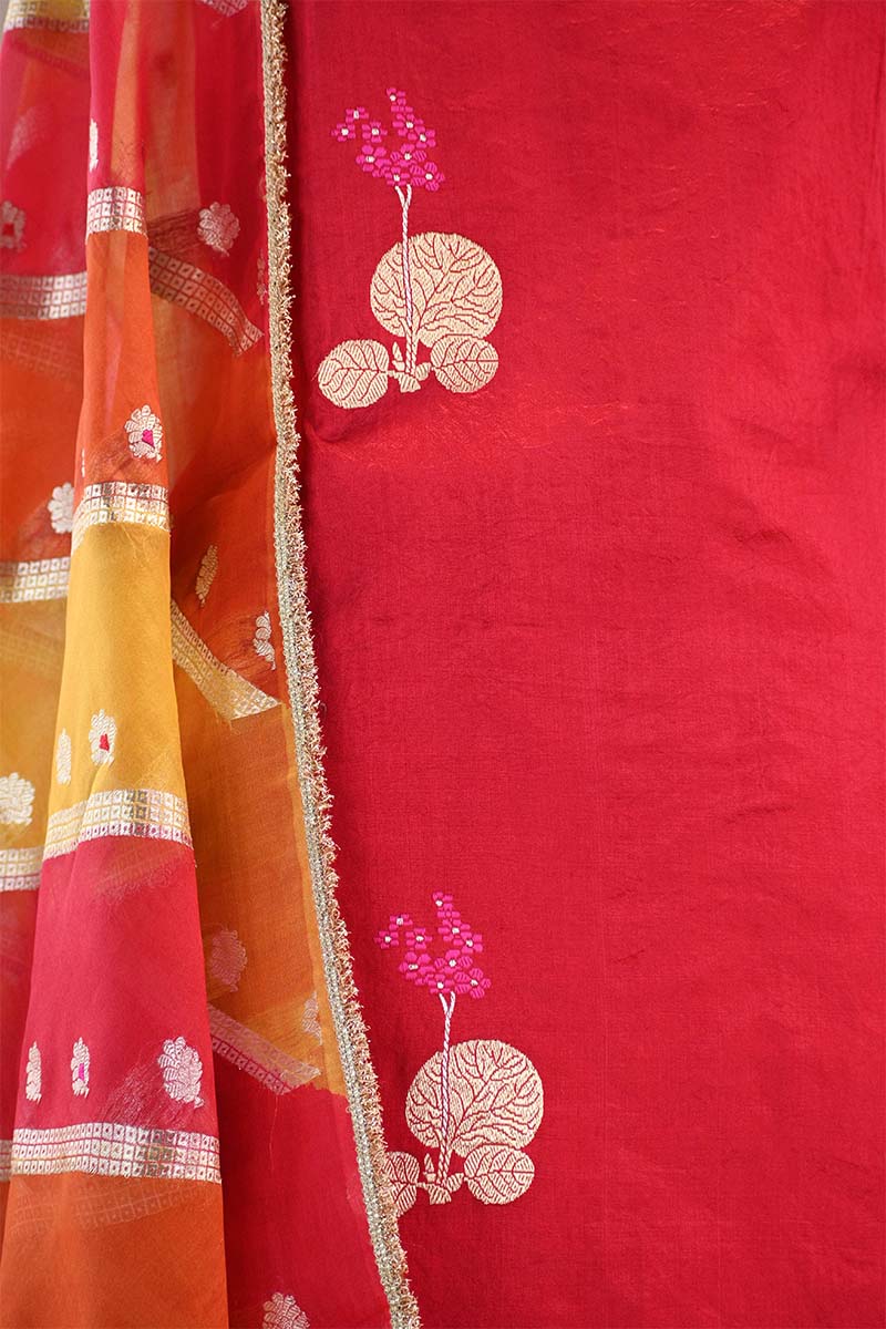 This Red Unstitched Suit Set is constructed from Pure Dupion Silk The kurta is detailed with gold zari and resham (silk thread) woven floral buta, utilizing a supplementary weft technique to integrate the floral designs with the base fabric. The Suit is paired with a Rangkat Organza Silk dupatta, which features a multi-colored gradient effect achieved through specialized weaving. The dupatta is further embellished with gold zari woven buti, resham accents, and intricate floral zari woven slanting stripes, finished with a contrasting gold zari woven border and pallu.