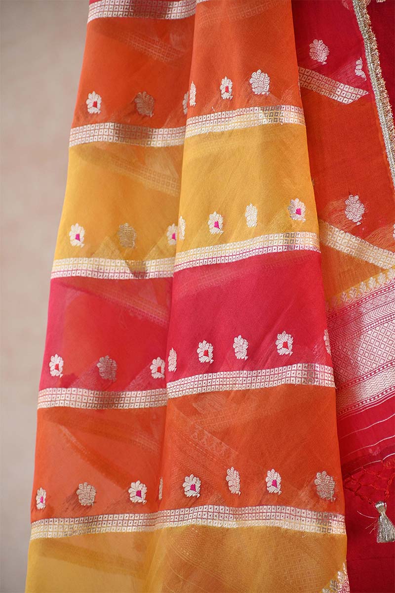 ⦁ Dupatta Detail: Contrast gold zari woven border and pallu