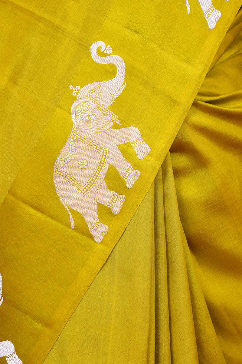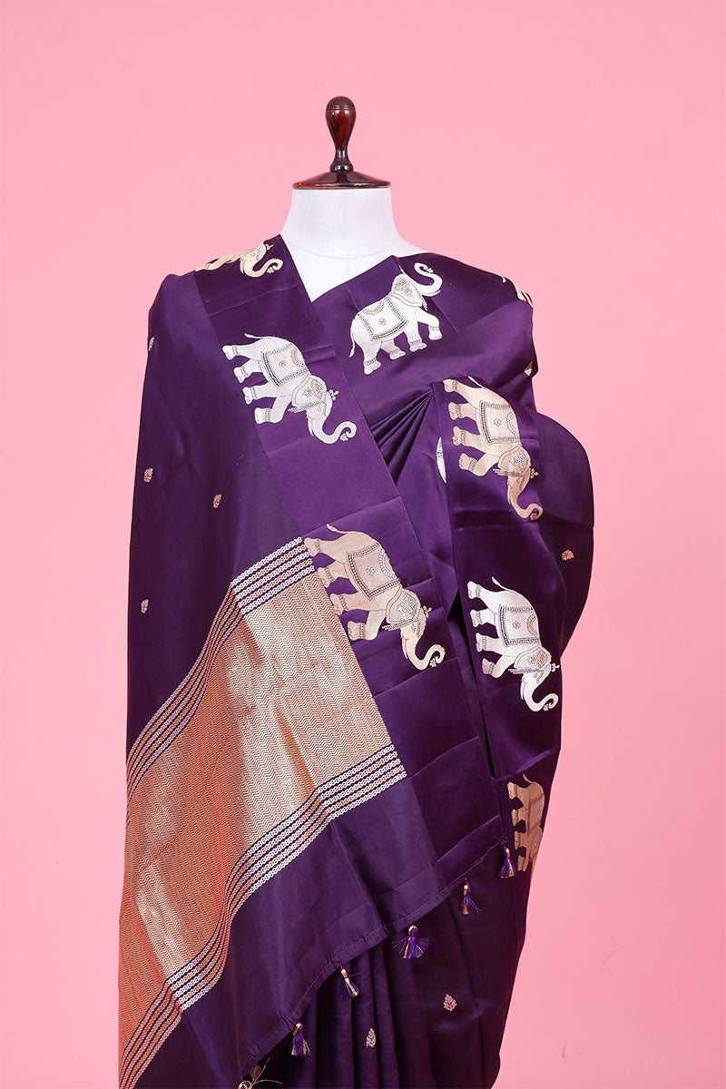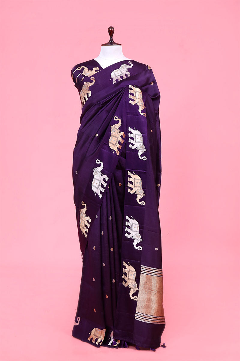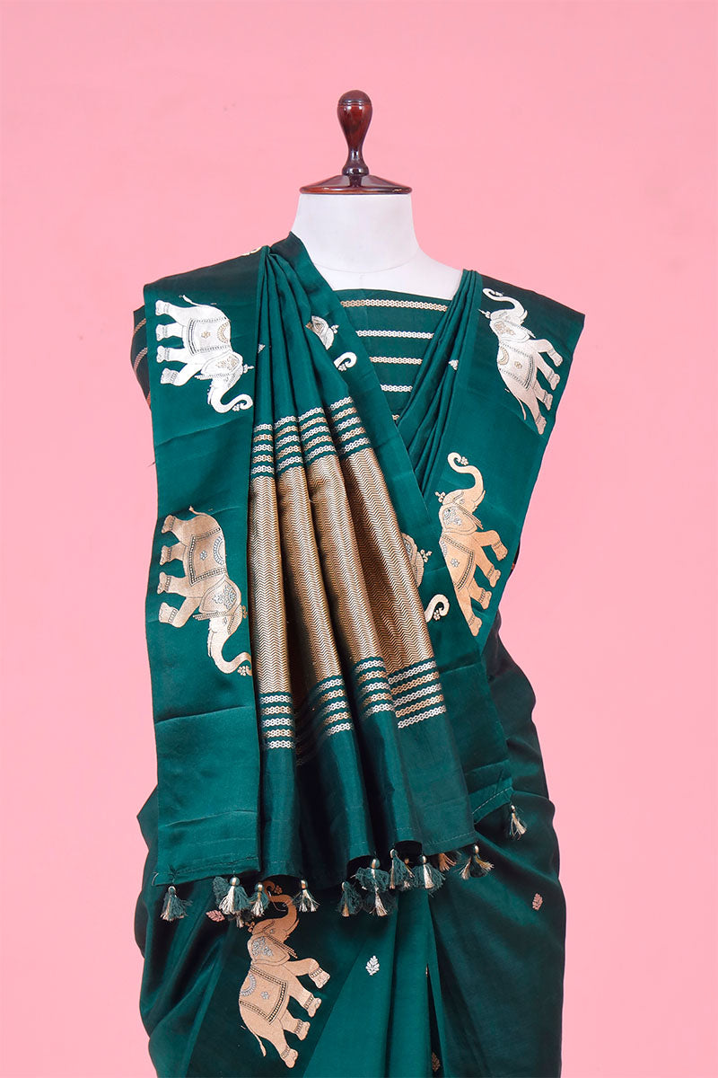 • Adorned with gold and silver zari kadhwa woven Gaja motifs, this saree features intricate detailing all over, including the border and pallu. Adorned with a graceful 5-kadi satin border and the body of the saree is 2 kadi banarasi silk.