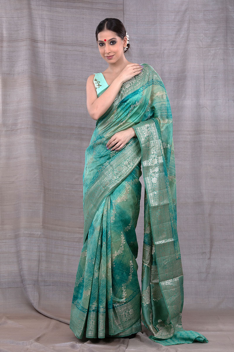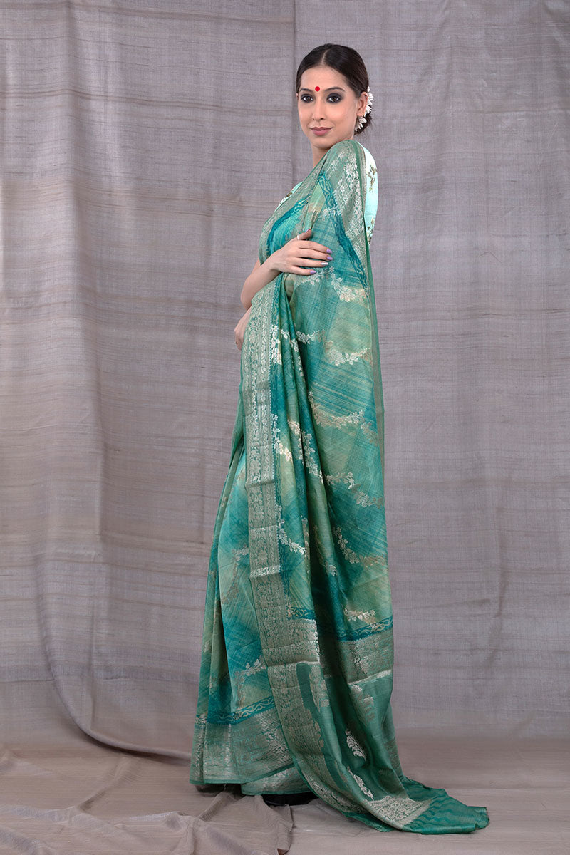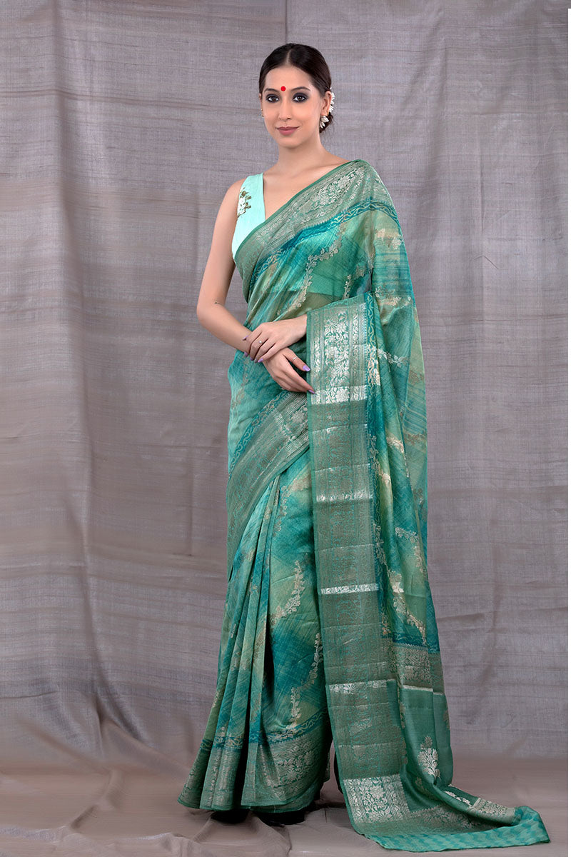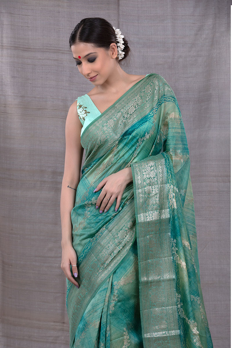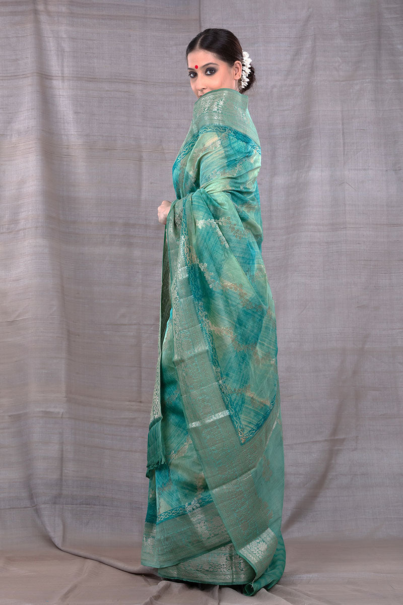 Immerse yourself in the captivating beauty of our ethereal Rangkat Chanderi Silk Saree. The intertwining water-gold zari woven leheriya stripes with contrast border and pallu exude a mystical opulence, setting it apart as a true work of art. With its regal allure and unmatched elegance, this saree becomes a symbol of individuality and grace. Accompanied by a contrasting unstitched blouse piece, it completes a truly unique and enchanting ensemble.