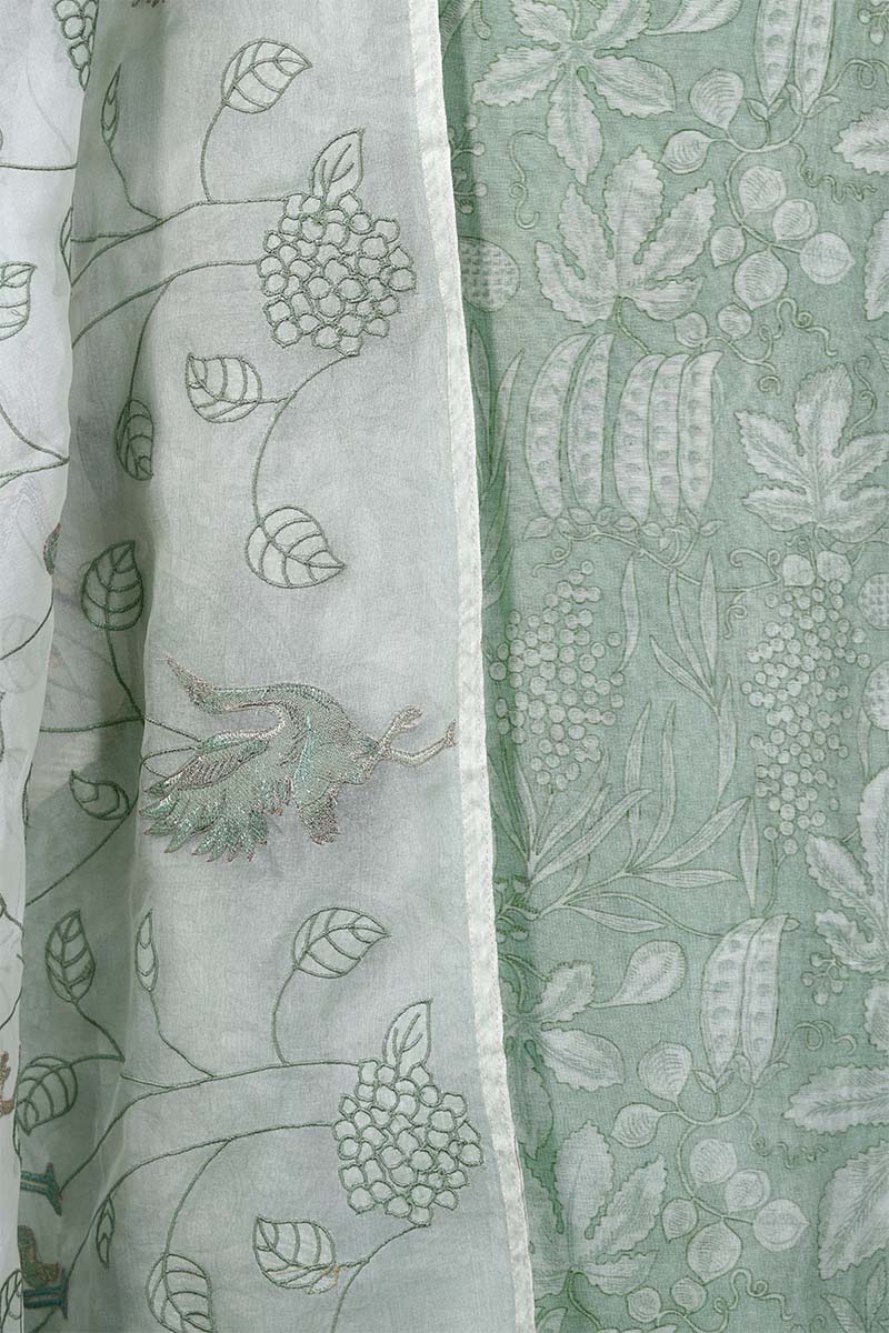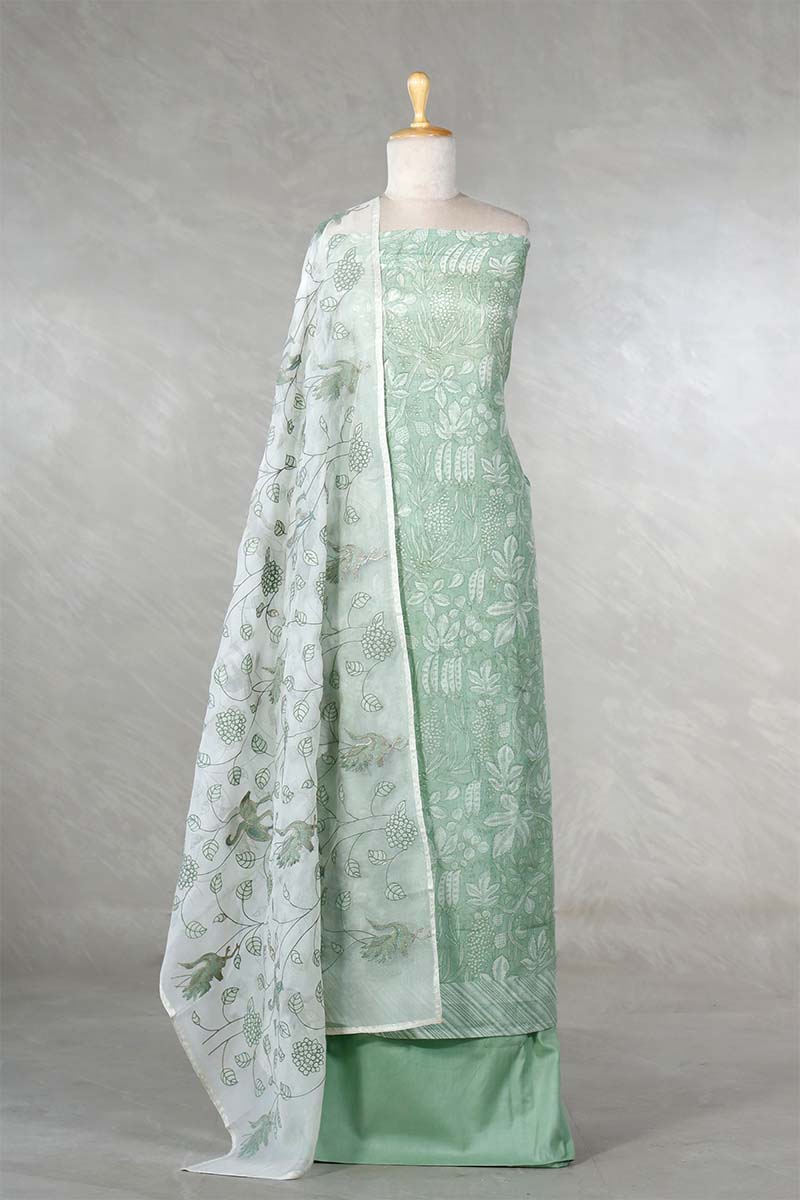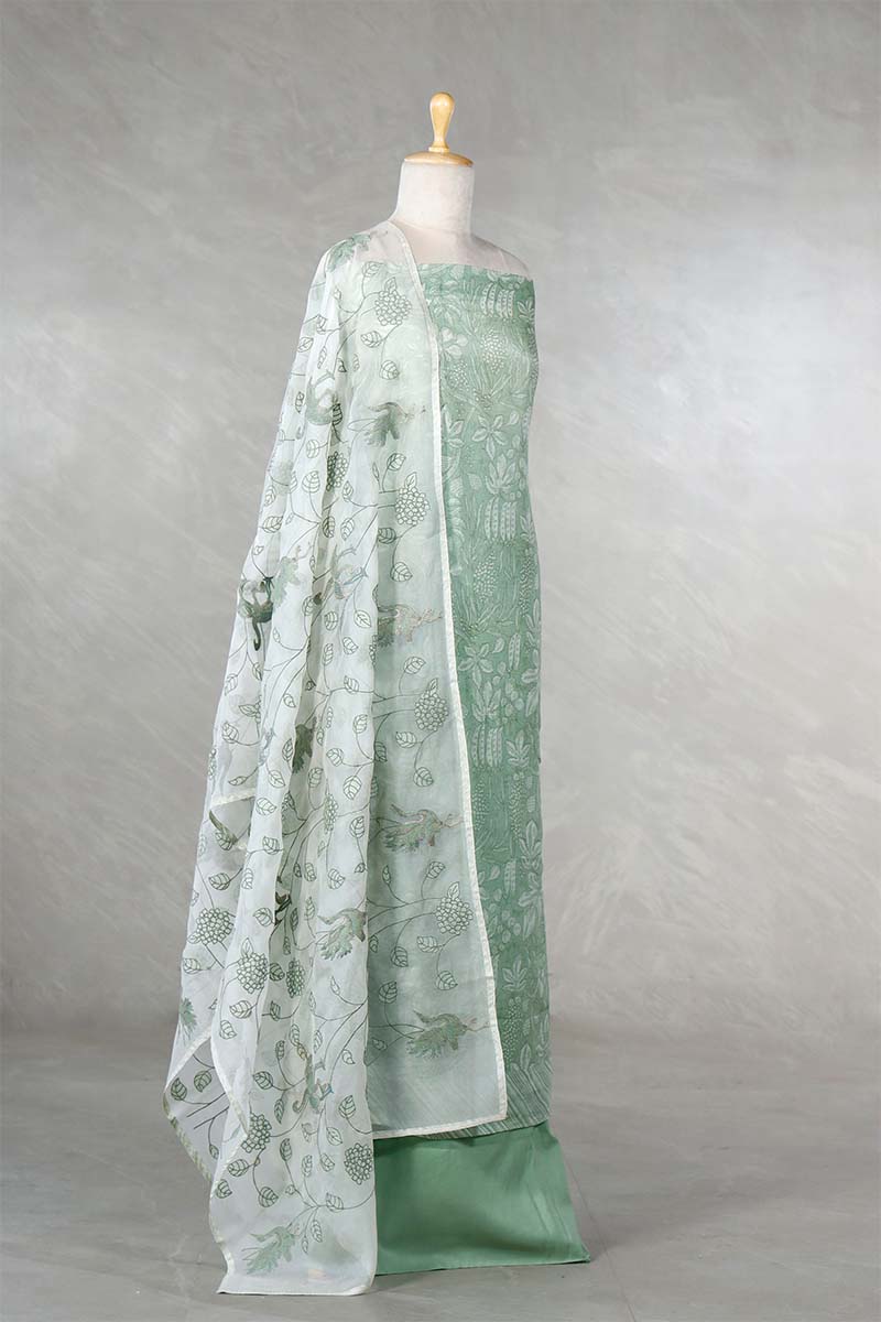 This Green mulmul cotton suit set is a lightweight and breathable choice for casual outings and daytime gatherings. The kurta features digital floral prints all over, offering a fresh and seasonal look. It is paired with a plain cotton silk bottom pant and a matching organza silk dupatta, highlighted with appliqué work in birds and floral jaal patterns. This coordinated dress material is easy to wear and style.