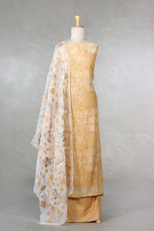 This light yellow mulmul cotton suit set is a lightweight and breathable choice for casual outings and daytime gatherings. The kurta features digital floral prints all over, offering a fresh and seasonal look. It is paired with a plain cotton silk bottom pant and a matching organza silk dupatta, highlighted with appliqué work in birds and floral jaal patterns. This coordinated dress material is easy to wear and style.