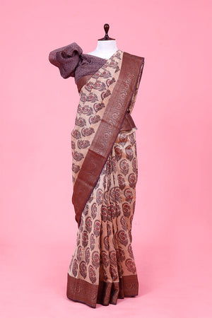 - This saree is adorned with an black printed ethnic floral print, featuring an antique zari woven border and pallu.