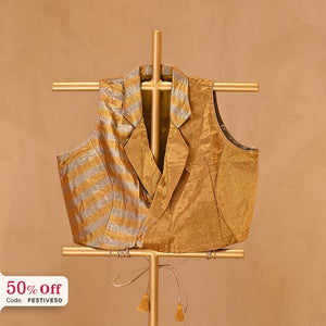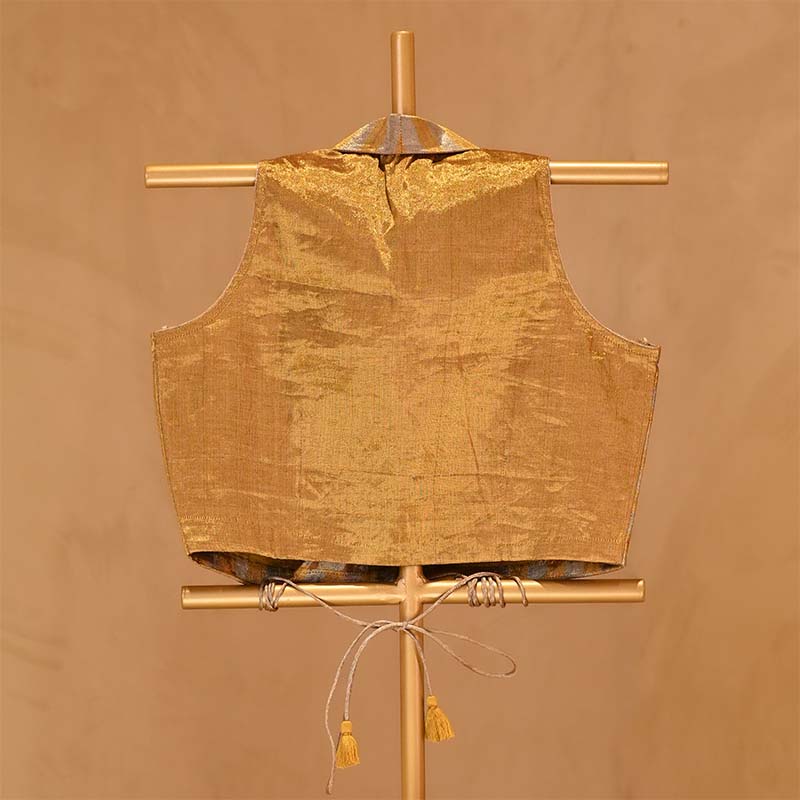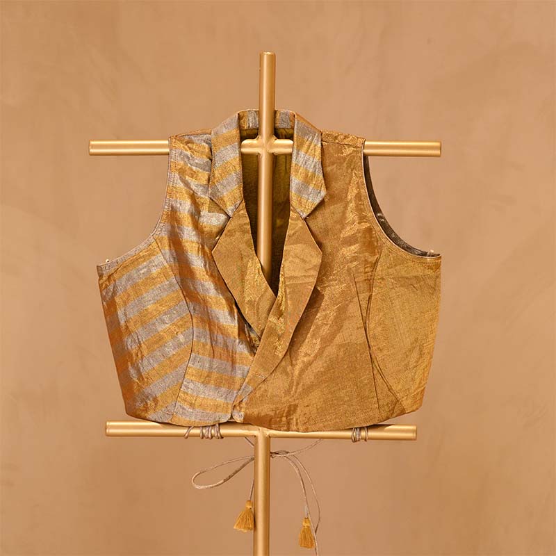 Our Gold Tissue Blouse, a masterpiece of glamour and grace. Crafted with classic woven gold and silver stripes, it exudes luxurious allure. The collared neckline adds a touch of sophistication, while the sleeveless design offers a contemporary edge. Complete with doris at the back for a customizable fit, this blouse seamlessly blends style and comfort. Perfect for any formal or informal ocassions.