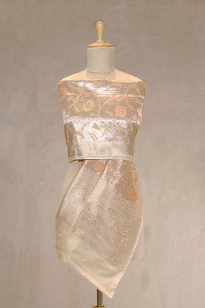 This Paithani dupatta, crafted in Banarasi Katan silk, features an elegant black shade. Enhanced with gold zari weaving and a vibrant Paithani floral jaal, it is complemented by a border and pallu adorned with intricate gold zari floral designs.
