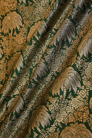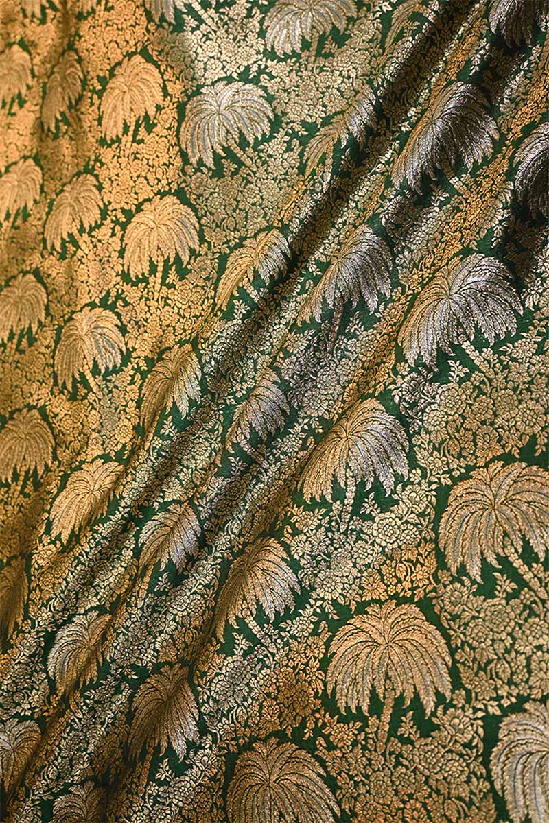 This green Banarasi silk fabric features an intricately designed floral jaal pattern woven with gold zari. The fabric is further enhanced with distinctive palm tree motifs in gold and silver zari, thoughtfully placed within the jaal design to add character and charm.