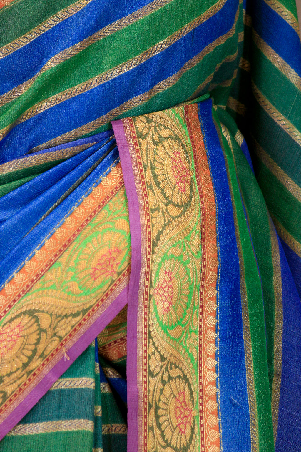 This green-blue Banarasi Tussar Khaddi silk saree is woven in exquisite Rangkat style, blending harmonious shades with a unique gradient effect. The saree is adorned with intricate water gold zari woven designs and stripes across the body. The ethnic hand-brushed contrast border and pallu add a distinctive artistic touch. It comes with a matching unstitched blouse piece, perfect for personalized tailoring.