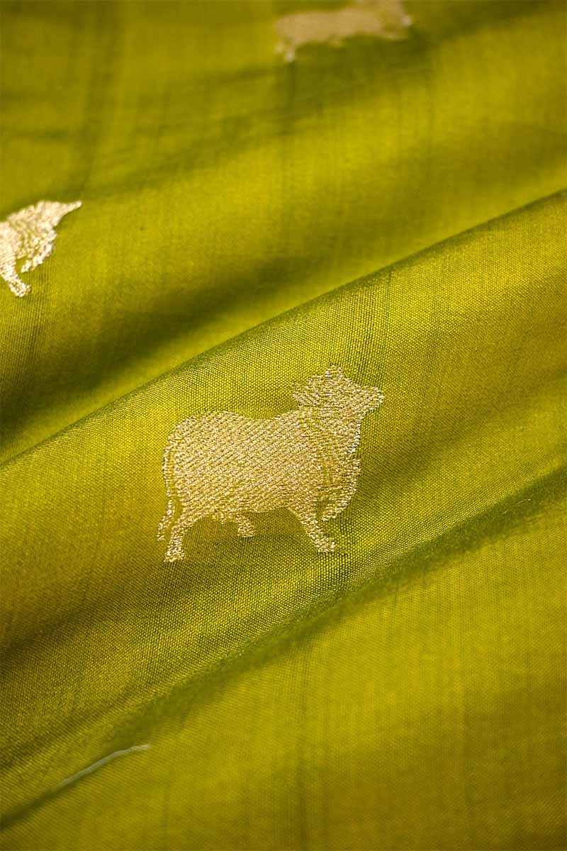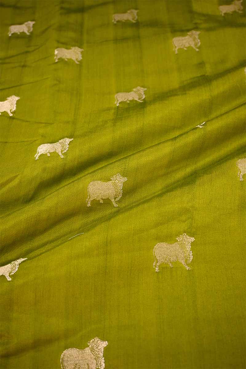 This Green Banarasi Chiniya silk fabric features golden zari woven Pichwai cow motifs all over, inspired by the divine themes of Lord Krishna. The detailed cow pattern and rich base make it a great choice for crafting special wedding blouses or festive dresses.