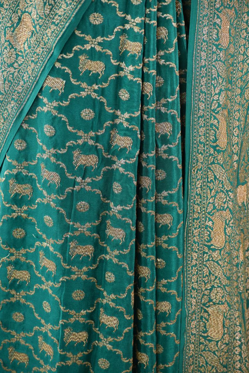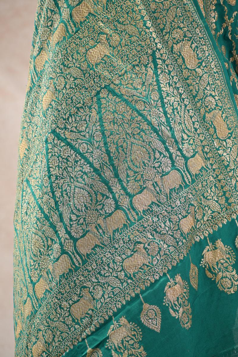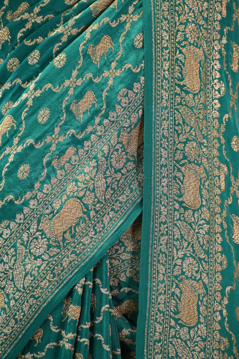 This green crepe Banarasi silk saree is woven with an intricate gold zari Pichwai floral jaal spread gracefully across the entire body. The border and pallu feature rich gold zari woven Pichwai floral patterns, adding a touch of elegance. It comes with a matching unstitched blouse piece.