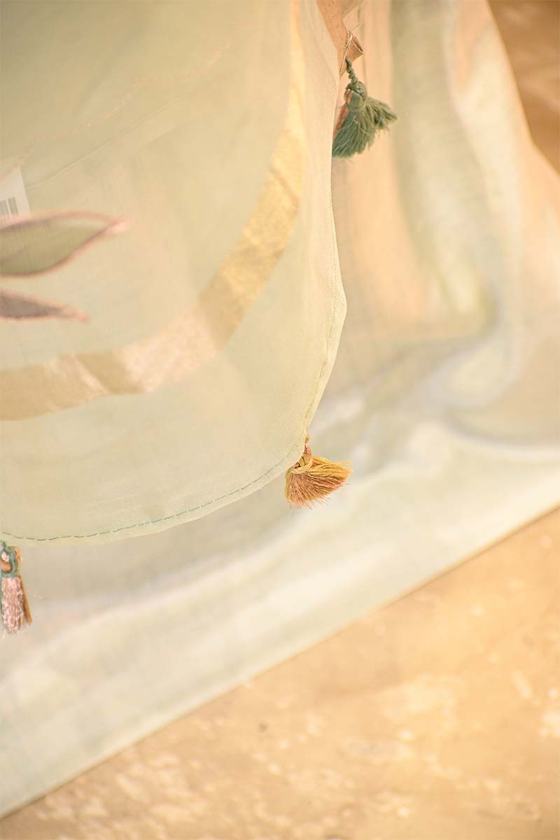 This green organza silk suit set showcases a beautiful hand-painted tiger-on-trees pattern on the kurta, highlighted with fine aari handwork embellishment to accentuate the artwork. The set is paired with a matching hand-painted organza silk dupatta, also enhanced with delicate aari handwork for a coordinated look. It comes with a matching plain cotton silk bottom fabric for a complete ensemble.