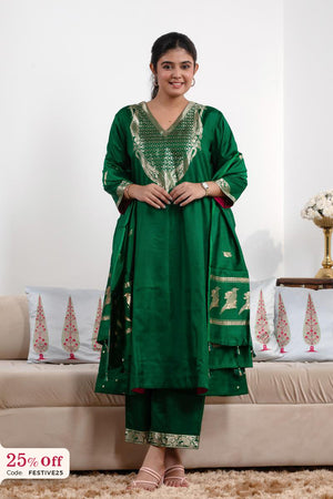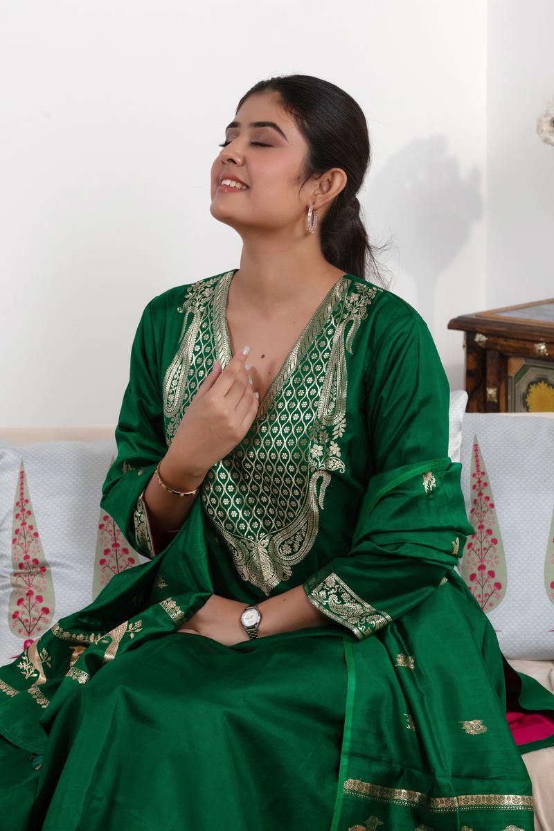 This green Banarasi Katan silk suit set features a straight-cut kurti features a V-neckline, with the yoke highlighted by an intricate combination of zari jaal and paisley woven motifs. The back of the kurti is adorned with small gold zari motifs, giving it a unique look.
