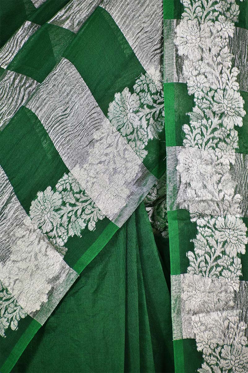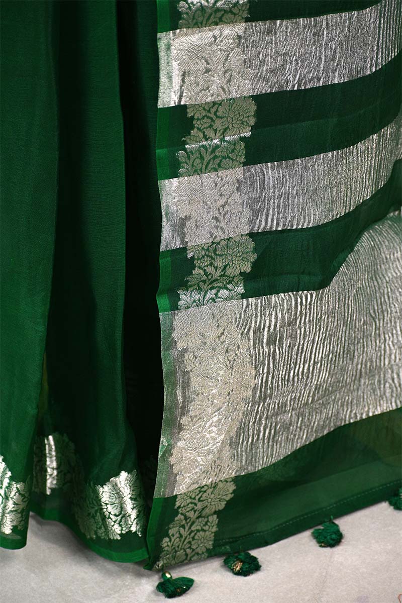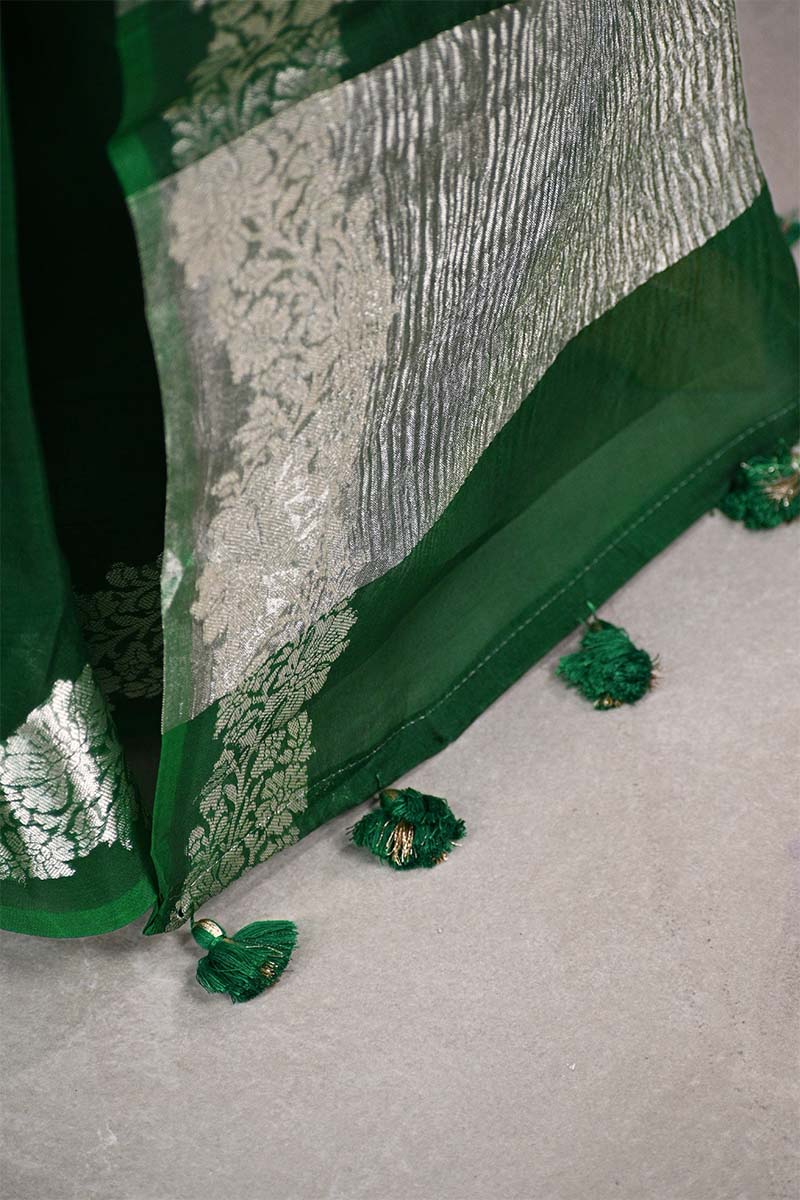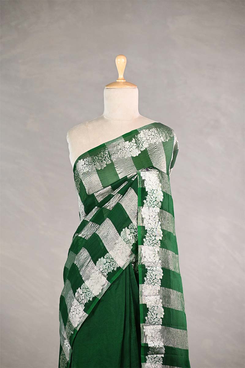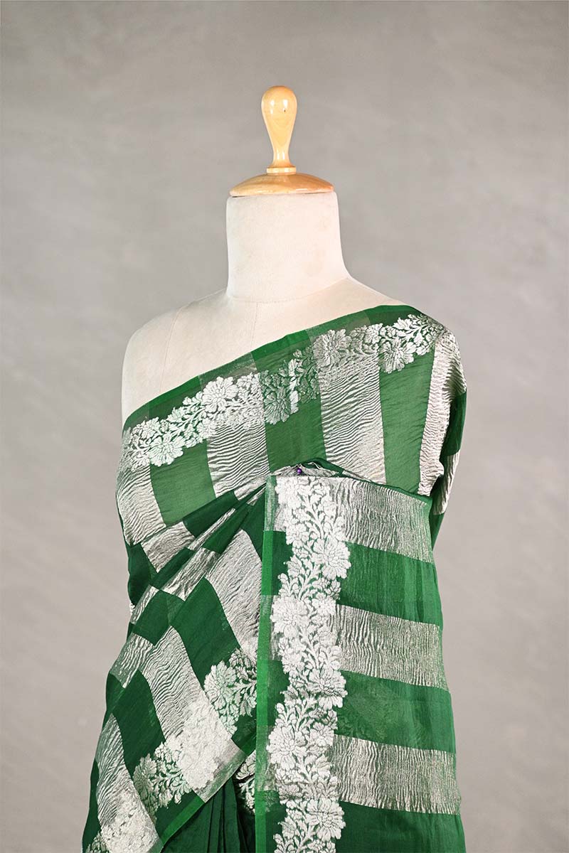 This green pure organza silk saree is designed with crushed tissue silver zari woven stripes on the half of the body, and the rest body is woven with plain organza silk. The border is complemented with floral zari leheriya woven work. It comes with a chiniya silk unstitched blouse piece with a floral zari border for custom stitching.