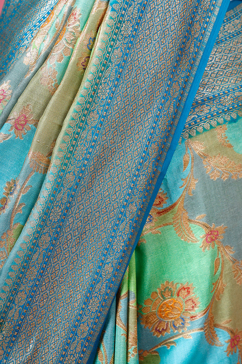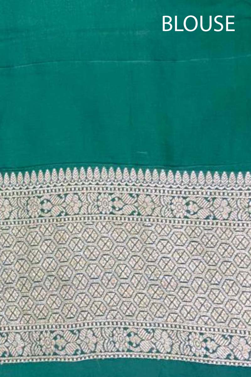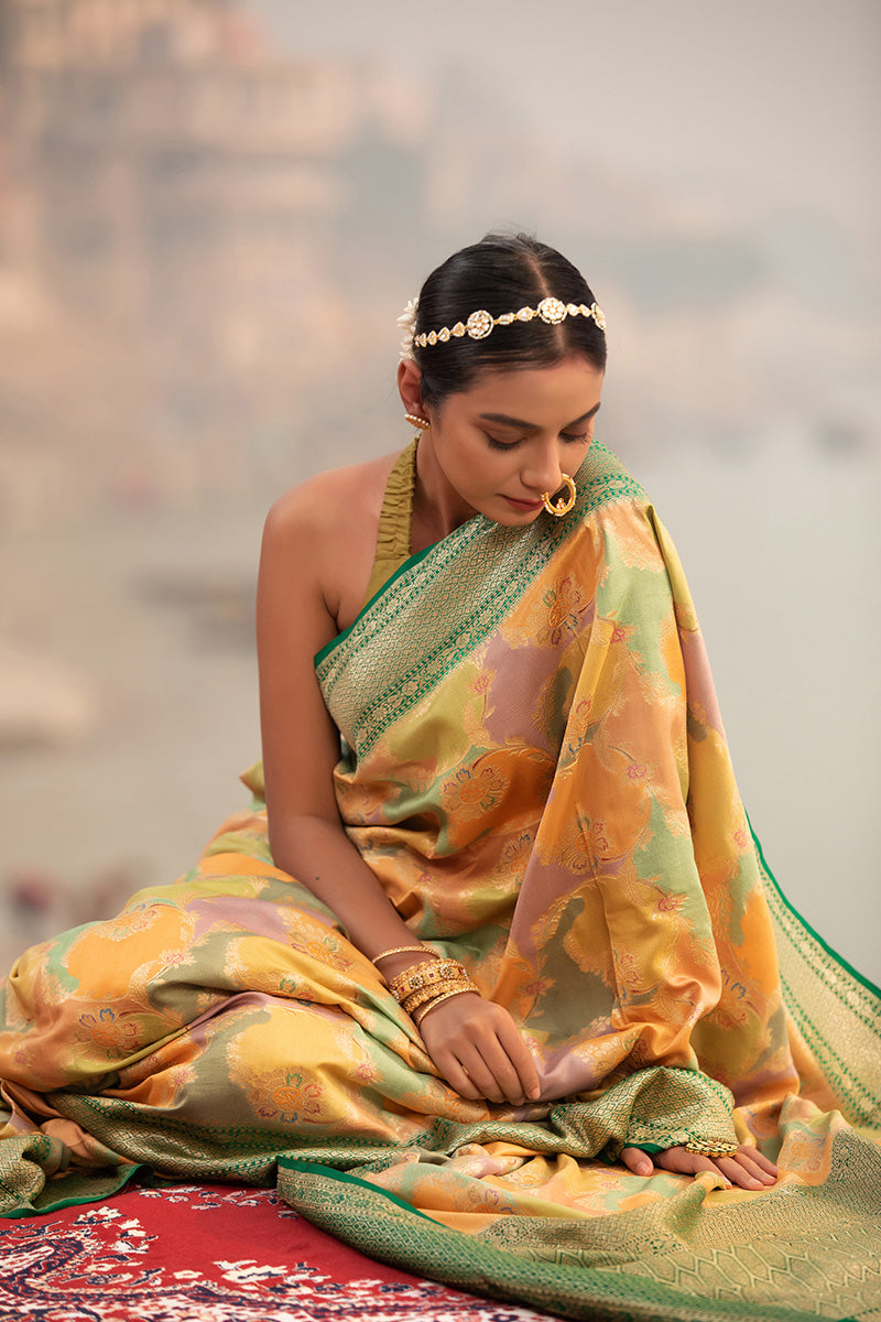 Lend a distinct look to your ensemble by choosing this green-coloured delight. Adorned in a gold zari woven floral jaal and rangkat motifs, this saree features a contrasting gold zari woven border and pallu and adds a touch of opulence. Crafted for comfort, this luxurious drape is made of quality chiniya silk fabric that lends a distinct shine to the drape. Accompanied by a contrasting unstitched blouse piece, this saree is a must-have.