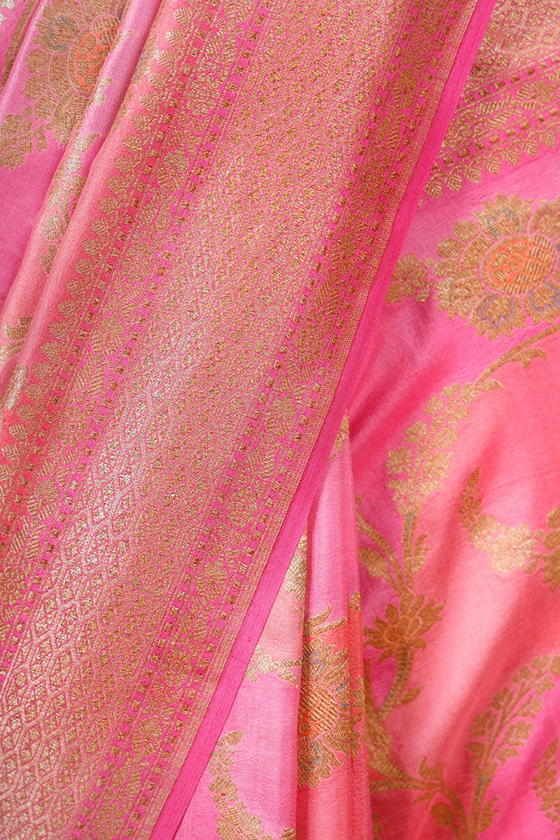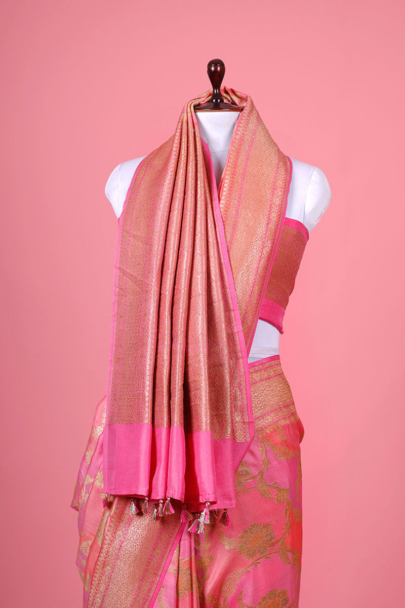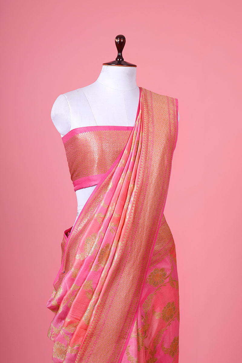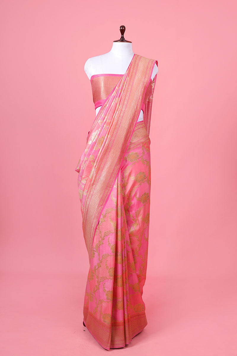 Lend a distinct look to your ensemble by choosing this green-coloured delight. Adorned in a gold zari woven floral jaal and rangkat motifs, this saree features a contrasting gold zari woven border and pallu and adds a touch of opulence. Crafted for comfort, this luxurious drape is made of quality chiniya silk fabric that lends a distinct shine to the drape. Accompanied by a contrasting unstitched blouse piece, this saree is a must-have.