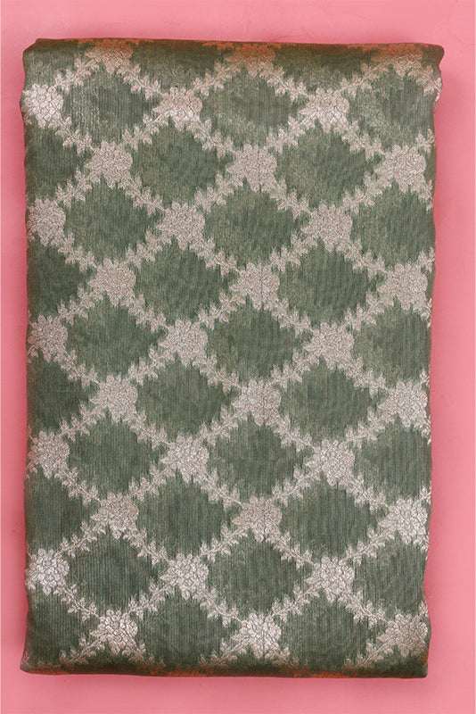 This Gree tissue silk fabric showcases a delicate floral gold zari criss-cross jaal pattern woven across the fabric. Its lightweight texture and intricate design make it a perfect choice for crafting elegant blouses or dresses.