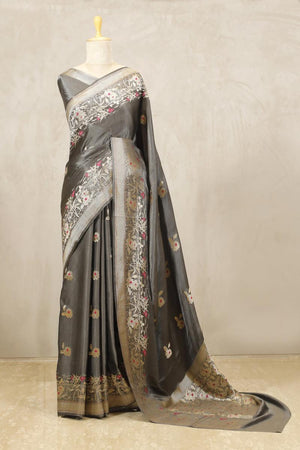 This grey Gajji silk Banarasi handloom saree is an artistic masterpiece featuring gold zari woven lotus butis adorned with meenakari work throughout the body. The saree beautifully showcases a combination of nature-inspired motifs, including ponds, lotus, sunrise, and plants, intricately woven with gold zari and enhanced with meenakari accents. A delicate thin geometrical gold zari woven border and pallu complete the design. It comes with a matching unstitched blouse piece, perfect for custom tailoring.