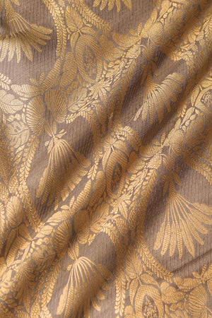This grey Banarasi silk brocade fabric showcases an exquisite water gold zari ethnic and floral jaal pattern handloom woven throughout. Its rich texture and intricate detailing make it a perfect choice for crafting custom-designed blouses.