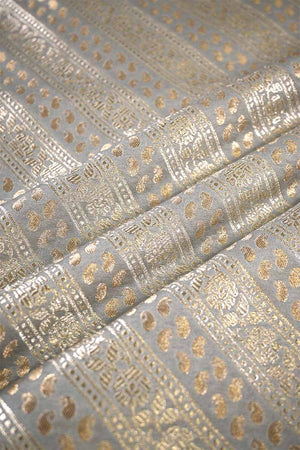 This grey Banarasi silk fabric features gold zari woven floral slanting stripes alternated with silver zari paisley motif butis. The dual-tone zari work and soft color tone make it a premium choice for blouses, sarees, or ethnic outfits.