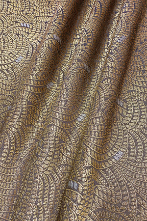This grey brocade Banarasi silk fabric features a sophisticated combination of gold and silver zari with an intricate jaal woven pattern. The refined design makes it a perfect choice for creating a stunning blouse or dress.
