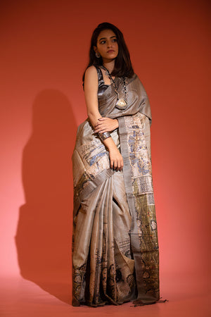 Featuring captivating digitally printed Baluchari motifs along the border, this saree makes a fine addition to your wardrobe. Each intricate design is elevated with delicate Aari work and adds a touch of artistry and charm to this exquisite saree. Made of quality tissue silk fabric, this saree is light in weight and has a distinct sheen that cannot be missed.