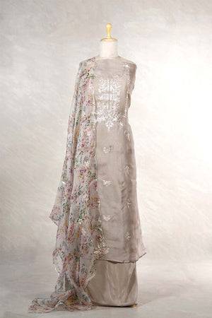 This grey organza silk suit set is crafted for festive occasions and ceremonial gatherings. The kurta features a designer neckline highlighted with heavy floral pitta zari embroidery and is adorned with pitta zari woven floral buti along with scattered embellished motifs across the fabric. It is paired with a floral printed organza silk dupatta enhanced with embellishments and finished with a scalloped embellished border. The set includes a plain silk matching bottom fabric to complete the coordinated dress material.