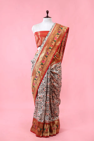 Pull in your inner diva with this amazing grey Paithani saree by Chinaya Banaras. The ethnic print all over the saree, along with the paithani-woven border and pallu, adds a touch of elegance to this saree. Made from a soft silk that gives a soft texture to the skin. Ideal for any occasion, be it a birthday party, an office event, a festival, or any wedding. Pair this with an unstitched blouse piece, subtle gold jewellery, and bold makeup to balance the entire look.