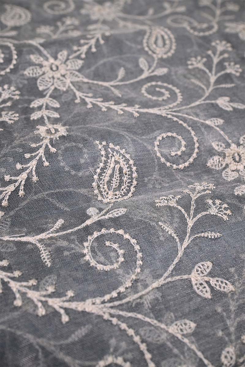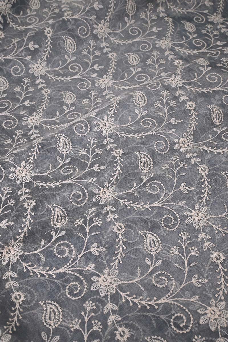 This grey tissue silk fabric features delicate resham chikankari floral embroidery, complemented with detailed leaf and floral patterns in white thread work. The lightweight tissue base with fine embroidery makes it perfect for graceful and contemporary outfit designs.